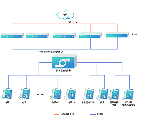 根據(jù)以上要求,公司語(yǔ)音通信系統(tǒng)采用集團(tuán)電話數(shù)字程控交換機(jī)實(shí)現(xiàn)多終端語(yǔ)音通信功能。根據(jù)綜合布線子系統(tǒng),本系統(tǒng)設(shè)計(jì)滿足120個(gè)終端使用,系統(tǒng)接入6部普通外線號(hào)碼及4部專用語(yǔ)音外線號(hào)碼,通過(guò)光纖解調(diào)器統(tǒng)一接入程控交換機(jī)。系統(tǒng)選用擴(kuò)容型插卡結(jié)構(gòu)數(shù)字程控機(jī),配置為8外線104分機(jī),交換機(jī)所有模塊均采用插卡結(jié)構(gòu),在維護(hù)、升級(jí)機(jī)器中,分機(jī)卡與外線卡通用(8外線一個(gè)卡/8分機(jī)一個(gè)卡),擴(kuò)容方便,節(jié)約成本,系統(tǒng)可擴(kuò)容至16外線128分機(jī),滿足擴(kuò)展性的要求。