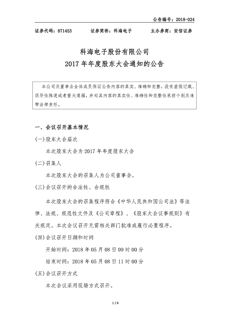 科海電子股份有限公司2017年年度股東大會通知的公告