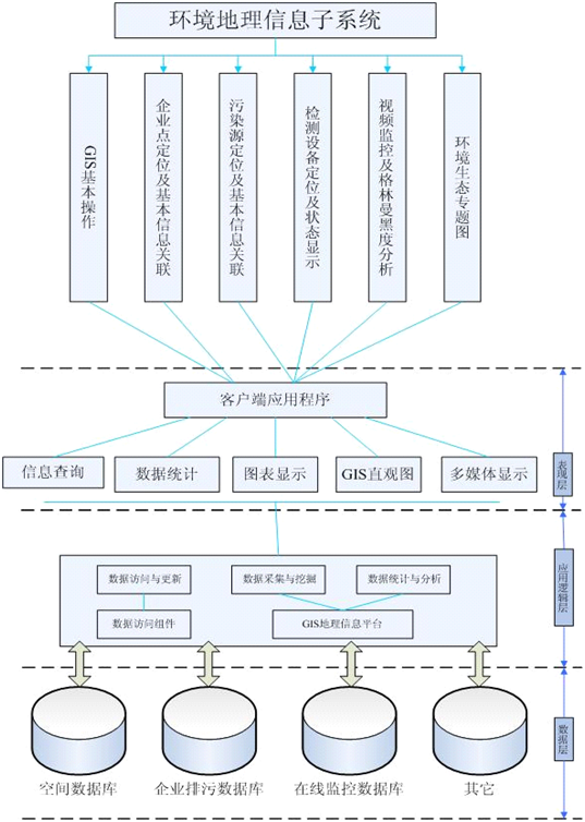 環(huán)境GIS充分利用現(xiàn)代計(jì)算機(jī)技術(shù)優(yōu)勢(shì),發(fā)揮強(qiáng)大的計(jì)算統(tǒng)計(jì)功能、可視化功能和多媒體展示功能,來(lái)管理和利用環(huán)境保護(hù)信息。其系統(tǒng)結(jié)構(gòu)框圖如下: