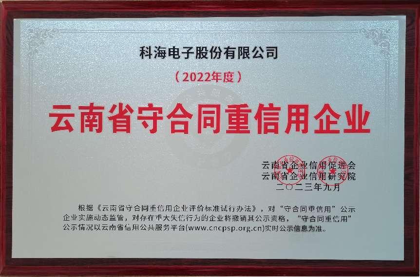 近日,云南省2022年度“守合同重信用”企業認定名單出爐,科海電子獲此殊榮。